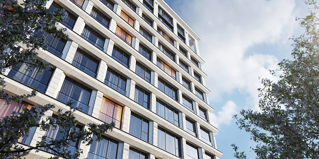 Особое внимание уделено деталям: высокие окна наполняют квартиры дневным светом, а потолки высотой до 6 метров создают ощущение простора и свободы. Концепция архитектуры интегрирована в ландшафт двора, что делает здание естественной частью своего окружения.