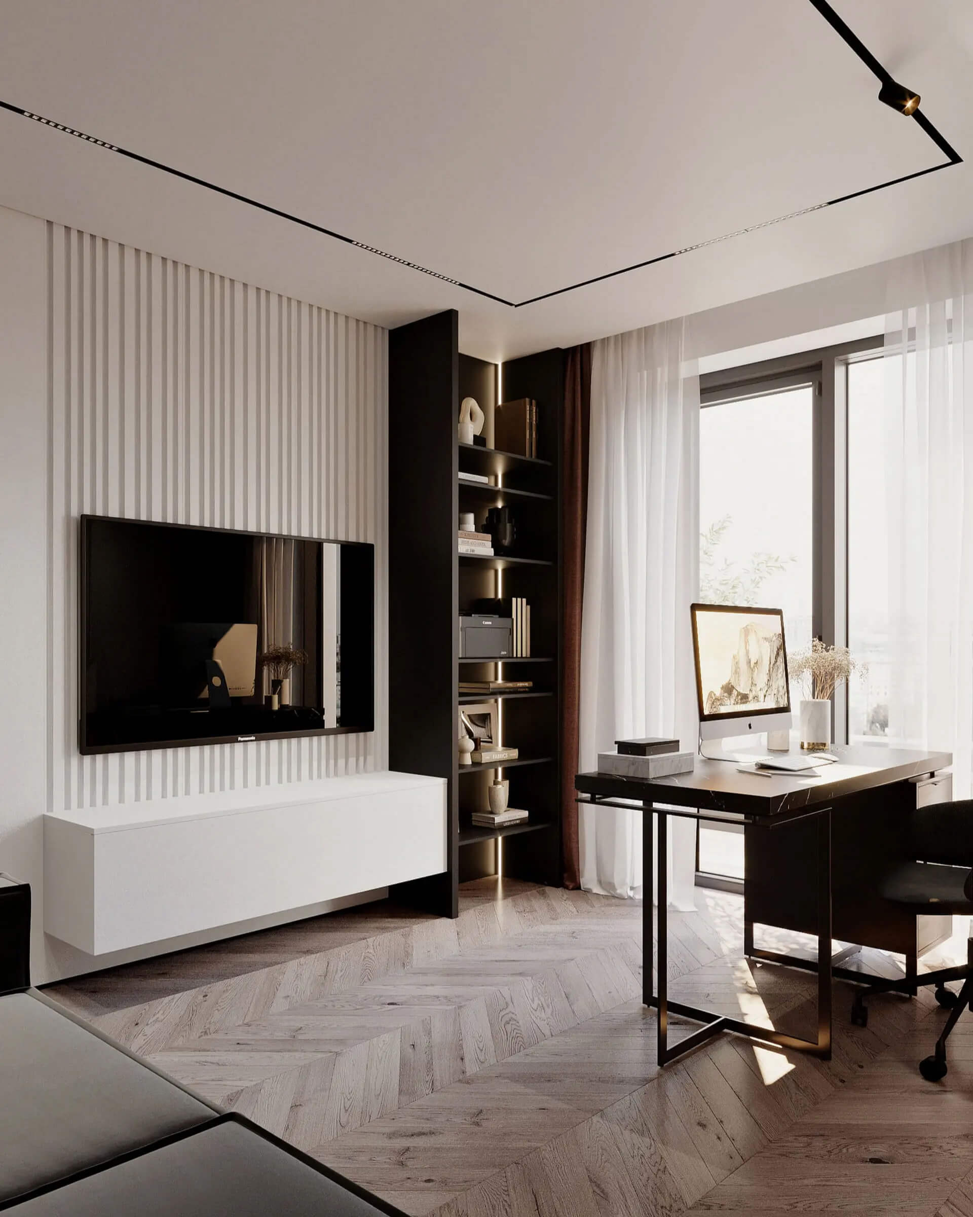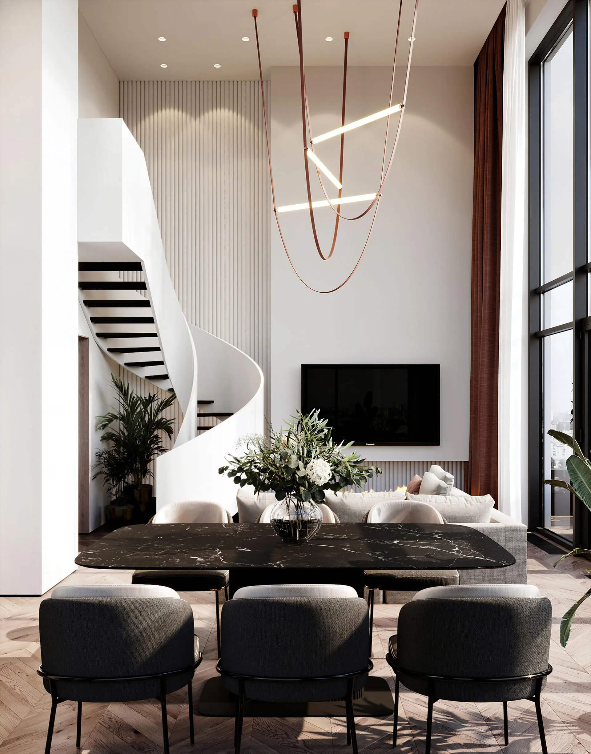 Интерьер сочетает современные материалы и классические элементы, создавая гармонию стиля и функциональности. Здесь приятно встретить гостей, провести деловую встречу или просто насладиться моментом в тишине.
